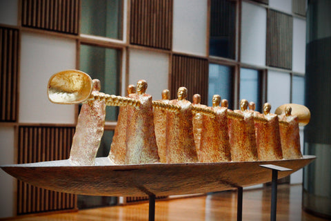 HEROLDER av Johan Fredrik Arntzen. Treskulptur og olje. 3 meter. Borregaard hovedkontor.